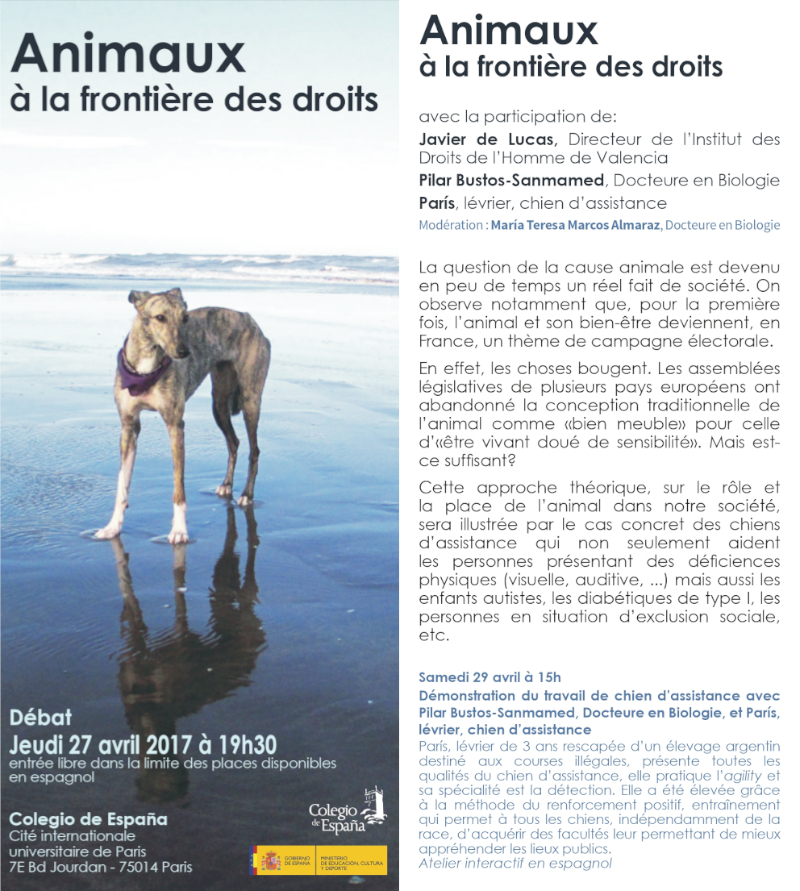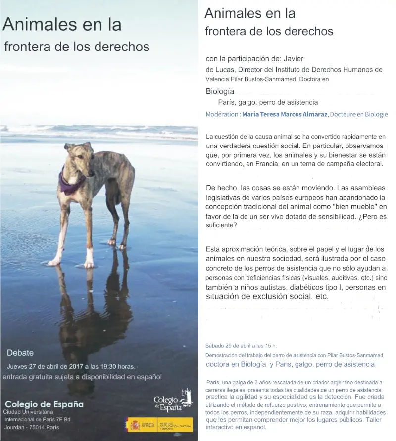 Con la participación de Javier de Lucas, director del Instituto de Derechos Humanos de Valencia y la Dra. en Biología Pilar Bustos, se celebró en el Colegio de España de París un coloquio sobre los derechos de los animales, bajo el título Animales en la frontera de los derechos, donde Teresa actuó como moderadora y co-organizadora.