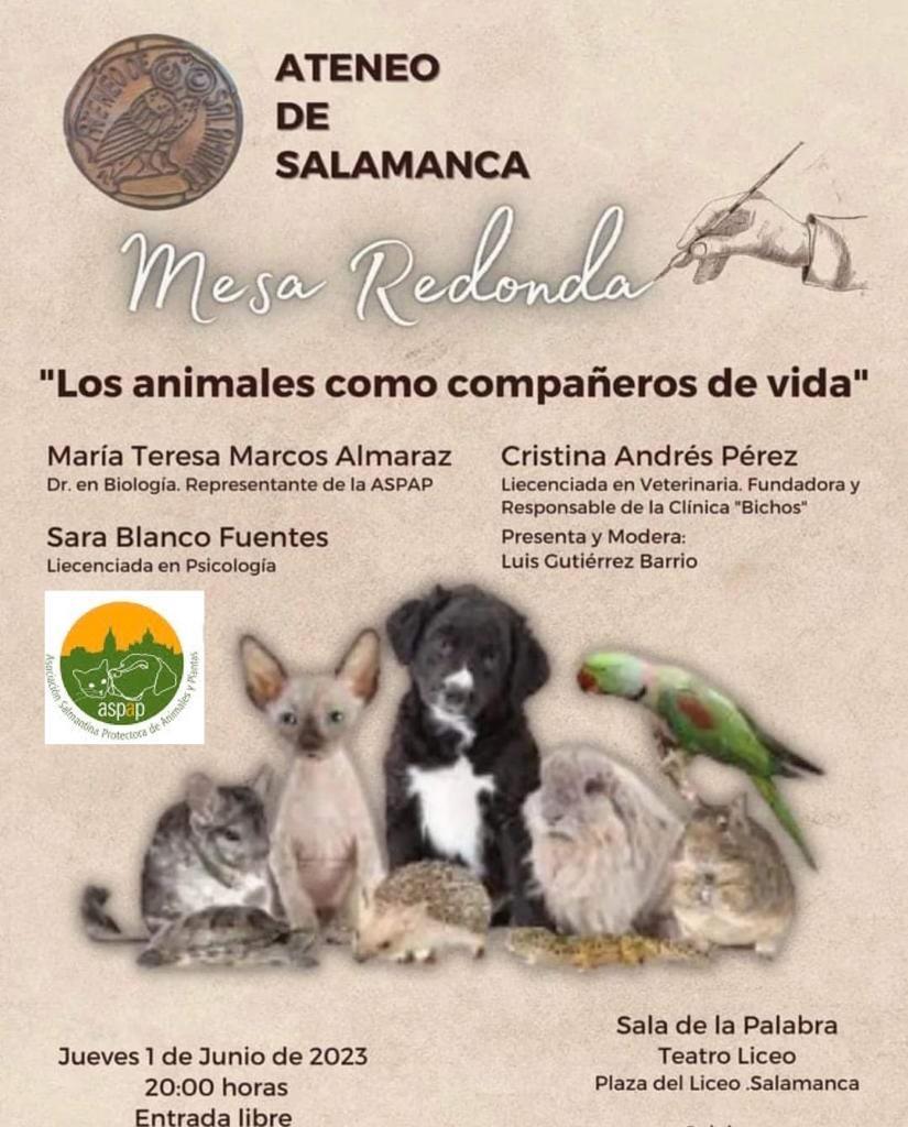 Junto a la psicóloga Sara Blanco Fuentes y la veterinaria Cristina Andrés Pérez, Teresa participó en la conferencia Los animales como compañeros de vida, organizada por la Fundación Ateneo de Salamanca y la Asociación Salmantina Protectora de Animales y Plantas (ASPAP).