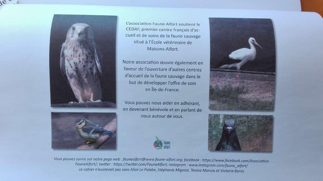 Dentro de nuestra labor divulgativa sobre la protección animal, también colaboramos en la elaboración de textos y materiales educativos, como fueron los cuadernillos infantiles del Centro de recuperación de Fauna Salvaje Faune Alfort, en París, en 2018.